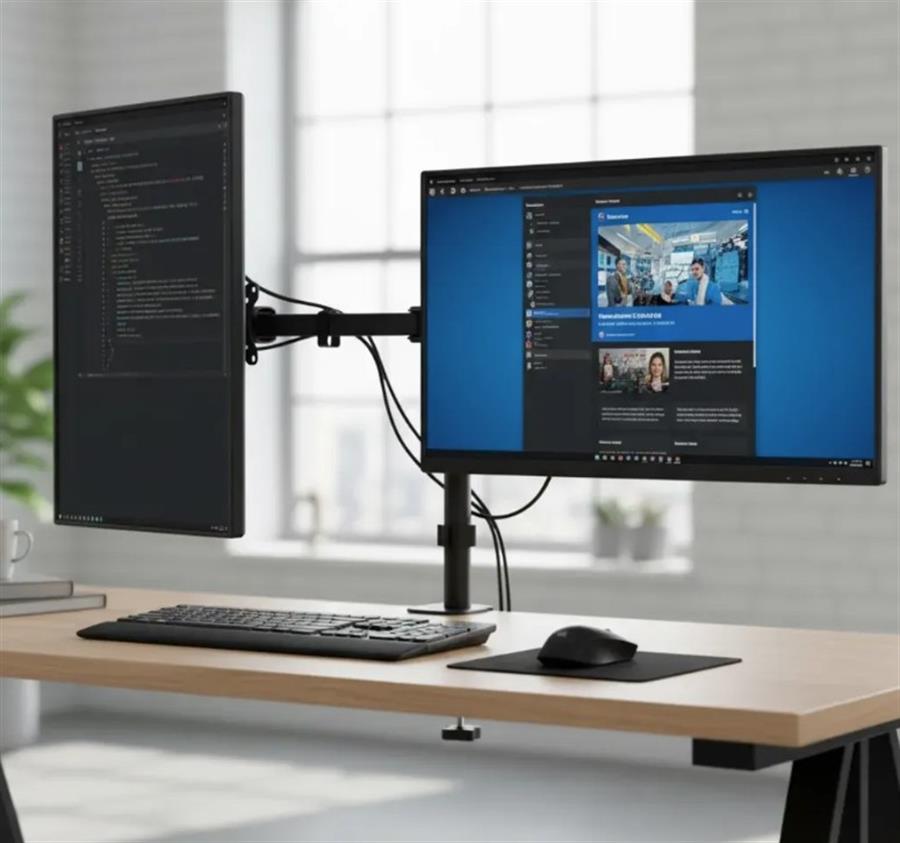 - Soporte doble para monitor con resistente base y brazos reforzados